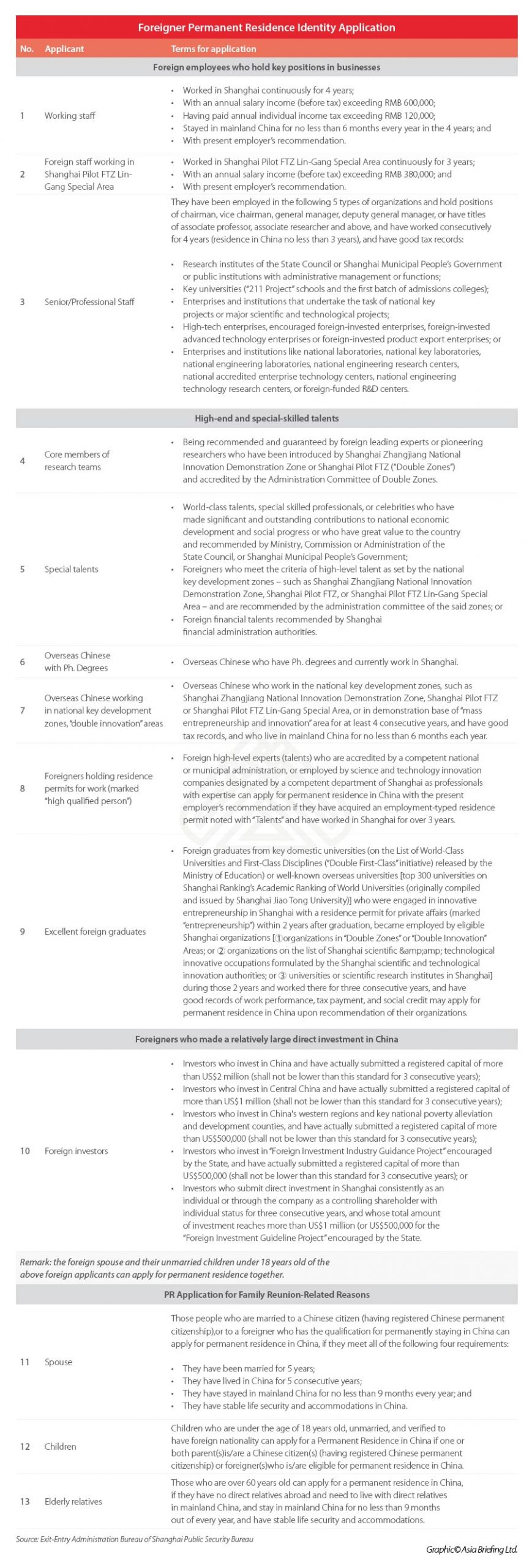 Shanghai now provides 13 categories of people that are eligible for permanent residency. Basically, they can be classified in four major groups – foreign employees holding key positions in enterprises, foreign talents, foreign investors, and linear relatives of a Chinese citizen or a foreigner with permanent residency in China.