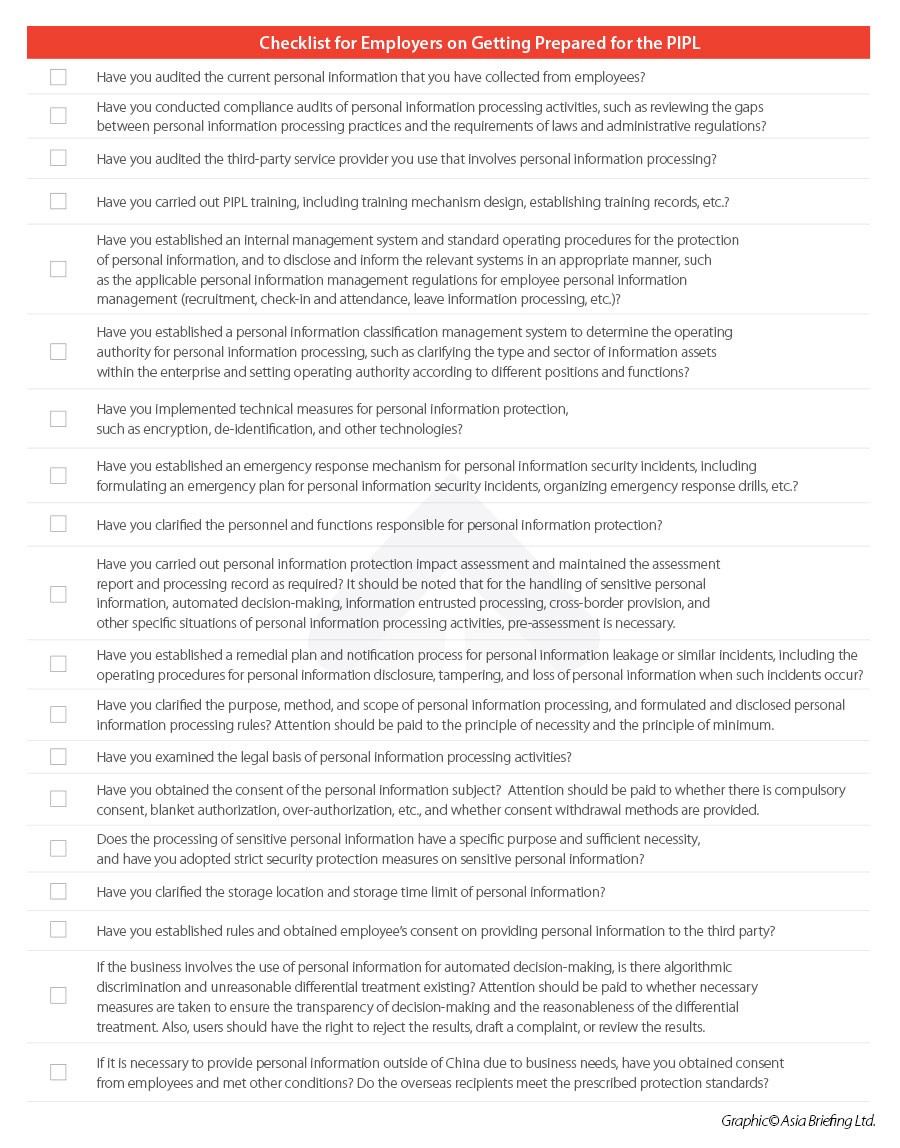 In view of the impact of the PIPL on employment management, employers should conduct a comprehensive review and evaluation of their employment management measures. This will enable employers to identify the possible legal risk management measures and formulate and adopt appropriate solutions and strategies within the organization, in keeping with the specific requirements of the PIPL.